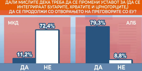 Вкупно 56,1 проценти од граѓаните сметаат дека не треба да се промени Уставот и во него да се внесат Бугарите и останатите народи за да се продолжи со преговорите со ЕУ. Само 27,5 проценти од анкетираните даваат поддршка за уставни…
