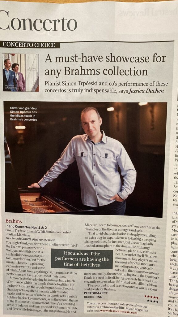 По највисоките оценки од „Тајмс“ и „Грамофон“, 5 ѕвездички за изведбата и одлична рецензија на новиот двоен албум снимен за британската етикета „Лин Рекордс“ на кој Симон Трпчески е повторно обединет со романскиот диригент Кристијан Мачелару и Симфонискиот оркестар на WDR од Келн, Германија, во изведбата на двата концерта за пијано и оркестар од Јоханес Брамс, во своето издание за јануари 2024 година, објави и престижниот БИ-БИ-СИ МУЗИЧКИ МАГАЗИН.