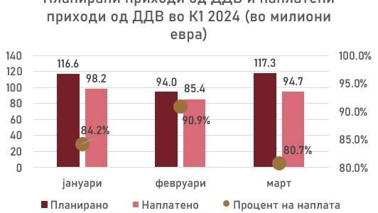 ПАД секој месец во однос на претходниот има кај приходот од ДДВ за прометот во земјата, oбјави на социјалната мрежа на Фејсбук, Елена Петрова, дополнителен заменик министер за финансии. НАПЛАТА НА БУЏЕТСКИТЕ ПРИХОДИ ВО ПРВИОТ КВАРТАЛ ОД 2024 год. Реализација…