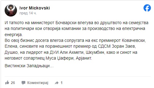 И таткото на министерот Бочварски влегува во друштвото на семејства на политичари кои отворија компании за производство на електрична енергија – коментира аналитичарот Ивор Мицковски. Во неговиот статус наведува Во овој бизнис досега влегоа сопругата на екс премиерот Ковачевски, Елена,…